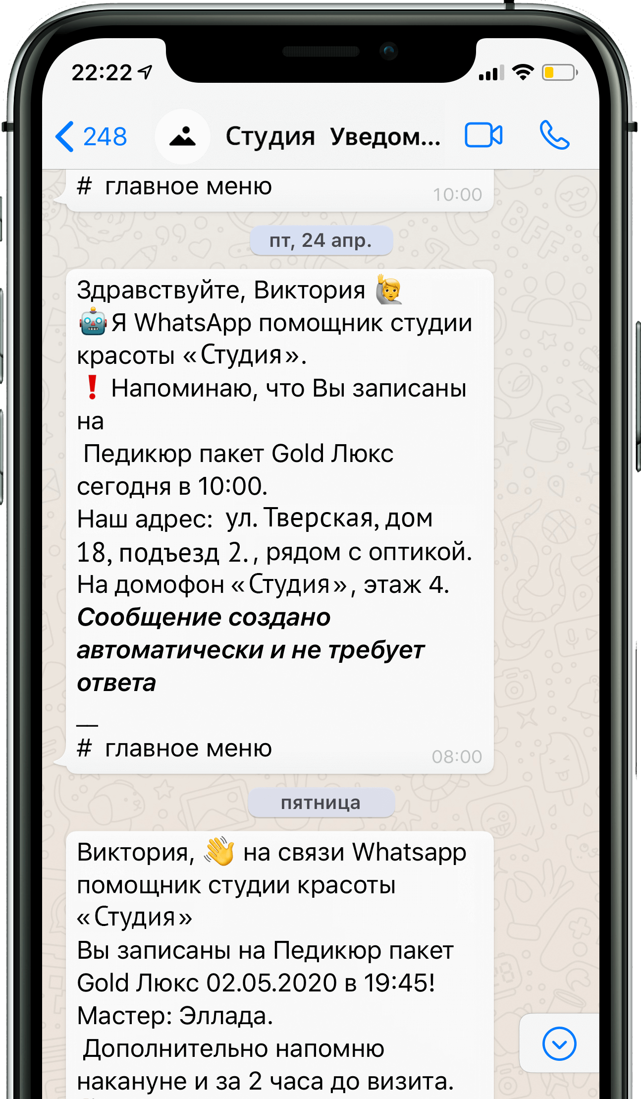 ✅ в рамках интеграции с YCLIENTS отправлять сервисные сообщения в Telegram по номеру телефона клиента